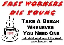 The IWW promotes the concept of "One Big Union", and contends that all workers should be united as a social class to supplant capitalism and wage labor with industrial democracy.[14] It is known for the Wobbly Shop model of workplace democracy, through which workers elect their own managers[15] and other forms of grassroots democracy (self-management) are implemented. The IWW does not require its members to work in a represented workplace,[16] nor does it exclude membership in another labor union.[17]