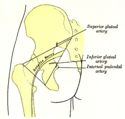 The inferior gluteal artery (sciatic artery) is a terminal branch of the anterior trunk of the internal iliac artery. It exits the pelvis through the greater sciatic foramen. It is distributed chiefly to the buttock and the back of the thigh.