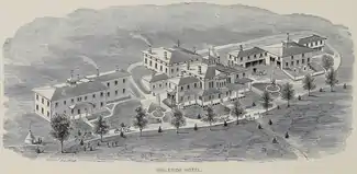 Completed in 1868, the hotel cost Mr. Davis a total of $162,000 (approximated $3.6 million in 2016 US Dollars), and opened on July 4. On July 21, 1871, the hotel hosted the first college rowing regatta in the United States held by the Rowing Association of American Colleges, one of the country's earliest intercollegiate undergraduate sporting events. Held on the banks of the Connecticut River, Massachusetts Agricultural College won the event in an upset against the teams of Harvard, Yale, and Brown.[10] This would be one of the only significant events in the resorts history however, as following the Panic of 1873, it would be sold at auction to one N.S. Chandler "for a little less than $30,000".[8] The hotel, which featured a farm, telegram station, gasworks, and railway stop, was short-lived however, and closed in the winter of 1874 due to low attendance in the midst of an economic depression.[11] The hotel was razed by fire on July 25, 1875, with some indication that the blaze "was the work of an incendiary".[12][13] The hotel and its contents were insured in total for $20,000.[14] Though the hotel itself stood on the shores of the Connecticut for less than a decade, the Ingleside name would persist as that of the surrounding area long after its absence.[15]