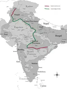 The Inland Customs Line, incorporating the Great Hedge of India (or Indian Salt Hedge[1]), was a customs barrier built by the British colonial rulers of India to prevent smuggling of salt from coastal regions in order to avoid the substantial salt tax.