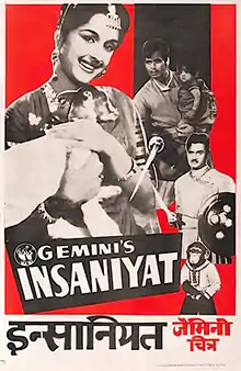 Insaniyat (transl. Humanity) is a 1955 Hindi-language action film produced and directed by S. S. Vasan. The film stars Dilip Kumar, Dev Anand and Bina Rai. The film's songs were written by Rajendra Krishan. The film's music is by C. Ramchandra. It is a remake of 1950 Telugu film Palletoori Pilla and is the only film to feature veteran actors Dilip Kumar and Dev Anand together onscreen.