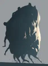 The Huddle, the amalgam of body parts that the player controls at the end of the game, had been an idea for the game since 2010, when animator Andreas Normand Grøntved had been brought aboard Playdead to do preliminary animations for it based on a drawing by artist Morten Bramsen.[23] Bramsen's drawing of the Huddle served to guide much of the visual nature and art style for the rest of the game.[23] To animate it, Grøntved took inspiration from the motion of Nago the demon form of the boar god from Princess Mononoke, the squishiness of the main character of the game Gish, and human behavior during crowd surfing.[23] Grøntved developed initial animations using what he called the Huddle Potato that simplified the geometries to demonstrate how the being would move and interact with the environment.[23] Whereas most of the other game animations were based on a combination of pre-set skeletal movements along with the physics engine, the Huddle had to be animated predominantly by a custom physics model developed by Thomas Krog, and implemented by Lasse Jon Fulgsang Pedersen, Søren Trautner Madsen, and Mikkel Bøgeskov Svendsen. This model uses a 26-body simulation of the core of the Huddle, driven by a network of impulses based on the direction of the player and the local environment, which allowed the Huddle to reconfigure itself as it needed in certain situations, such as fitting into tight spaces.[23] They then added six arms and six legs with some pre-set animations that would also help to drive the impulse in the main body simulation.[23] The skin of the huddle was a mix of art styles borrowed from the sculptures of John Isaacs, and the art of Jenny Saville and Rembrandt.[23] The vocals and bodysounds were performed by the renowned Danish-Austrian performance group SIGNA.[24]