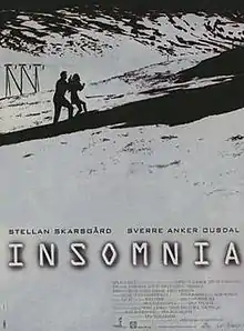 Insomnia is a 1997 Norwegian thriller film about a police detective investigating a murder in a town located above the Arctic Circle. The investigation goes horribly wrong when he mistakenly shoots his partner and subsequently attempts to cover it up. The title of the film refers to his inability to sleep, the result of his guilt (represented by the relentless glare of the midnight sun). Insomnia was the film debut of director Erik Skjoldbjærg. The screenplay was written by Nikolaj Frobenius and Skjoldbjærg, and the soundtrack by Geir Jenssen.
