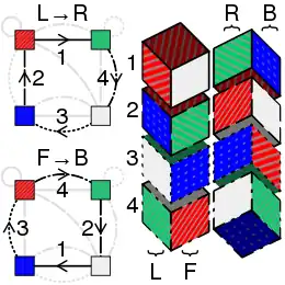 - The dotted arrow from Blue to Red says that the third cube will have Blue in the front face and Red at the Back.