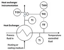 - In industrial applications gaseous or liquid fluids may be heated or cooled. This duty is undertaken in a heat exchanger, whereby the fluid is heated or cooled by heat transfer with a second fluid such as water, glycol, hot oil or another process fluid (the heating or cooling medium).[5][4] Temperature control is used to maintain the desired temperature of the first fluid. A temperature sensor transmitter (TT) is located in the first fluid at its outlet from the heat exchanger. This measured temperature is fed to the temperature controller (TIC) where it is compared to the desired set point temperature. The output of the controller, which is related to the difference between the measured variable and the set point, is fed to a control valve (TCV) in the second fluid to adjust the flow of the heating or cooling medium.[1] In the case of a fluid being cooled, if the temperature of the fluid rises the temperature controller acts to open the TCV increasing the flow of the cooling medium which increases the heat transfer and reduces the temperature of the first fluid. Conversely if the temperature falls the controller acts to close the TCV which reduces the heat transfer increasing the temperature of the first fluid. In the case of heating medium with the falling temperature of the first fluid the controller would act to open the TCV to increase the flow of heating medium thereby raising the temperature of the first fluid. The controller (TIC) may also generate high (TAH) and low temperature (TAL) alarms to warn operating personnel of a potential problem.[4]