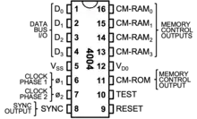To reach the price goals, it was important that the chip be as small as possible and use the fewest number of leads. As data was 4 bits and the address space was 12 bits (4096 bytes), there was no way direct access could be arranged with anything fewer than about 24 pins. This was not small enough, so the design would use a 16-pin dual in-line package (DIP) layout and use multiplexing of a single set of 4 lines. This meant specifying which address in ROM to access required three clock cycles, and another two to read it from memory. Running at 1 MHz would allow it to perform math on the BCD values at about 80 microseconds per digit.[15]