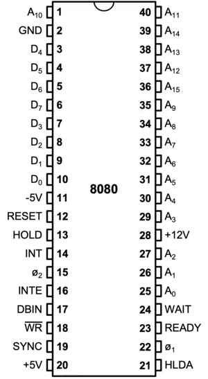 The Intel 8080 ("eighty-eighty") is the second 8-bit microprocessor designed and manufactured by Intel. It first appeared in April 1974 and is an extended and enhanced variant of the earlier 8008 design, although without binary compatibility.[3] The initial specified clock rate or frequency limit was 2 MHz, with common instructions using 4, 5, 7, 10, or 11 cycles. As a result, the processor is able to execute several hundred thousand instructions per second. Two faster variants, the 8080A-1 (sometimes referred to as the 8080B) and 8080A-2, became available later with clock frequency limits of 3.125 MHz and 2.63 MHz respectively.[4] The 8080 needs two support chips to function in most applications: the i8224 clock generator/driver and the i8228 bus controller. It is implemented in N-type metal–oxide–semiconductor logic (NMOS) using non-saturated enhancement mode transistors as loads[5][6] thus demanding a +12 V and a −5 V voltage in addition to the main transistor–transistor logic (TTL) compatible +5 V.