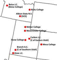 Boise State UniversitySnow CollegeUtah State University EasternColorado Mesa UniversityWestminster College (Utah)Weber State UniversitySouthern Utah UniversityAlbion State Normal SchoolBrigham Young University-IdahoUtah Tech University