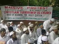 Small rallies were reported in Pakistan in Karachi and the central Pakistani city Multan with around 200 protesters.[67] There were also protests in Indonesia, Gaza, and India, a non-Muslim majority country.[74] On September 15, regarding reports that at least 20 deaths worldwide were connected to Quran desecration protests, Randall Terry responded that "Such logic is like saying that a woman who is abused by her boyfriend or husband is guilty of bringing violence on herself because she said or did something that irritated him."[75]