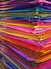 During the event, kite markets are set up alongside food stalls and performers. They are usually made with materials such as plastic, leaves, wood, metal, nylon and other scrap materials, but the ones for Uttarayan are made of light-weight paper and bamboo, and are mostly rhombus shaped with a central spine and a single bow.[17] Dye and paint are also added to increase the glamour of the kite. The lines are covered with mixtures of glue and ground glass which, when dried, rolled up and attached to the rear, also known as firkees, become sharp enough to cut skin.[16] These types of sharp lines are used on fighter kites, known in India as patangs, to cut down other kites during kite fighting events.
