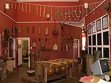 The akadinda (large xylophone), kalimbas on the wall, and a photo of Hugh Tracey.