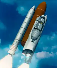 The Shuttle-C was a study by NASA to turn the Space Shuttle launch stack into a dedicated uncrewed cargo launcher. The Space Shuttle external tank and Space Shuttle Solid Rocket Boosters (SRBs) would be combined with a cargo module that take the place of the shuttle orbiter and include the Space Shuttle Main Engines. Various Shuttle-C concepts were investigated between 1984 and 1995.