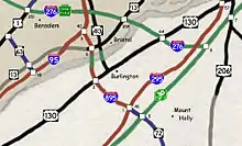 In 1963, the Delaware River Port Authority proposed several new bridges across the Delaware River in the Philadelphia area, including a high-level crossing between Bristol, Pennsylvania, and Burlington, New Jersey, near the existing Burlington–Bristol Bridge.[2] Following this proposal, a freeway was planned to link this bridge to I-295 near Burlington and I-95 near Bristol. This proposed freeway would be designated I-895 in the late 1960s. I-895 would have completed the partial beltway around Trenton formed by I-95 and I-295 as well as provided a beltway around Philadelphia along with the Pennsylvania Turnpike, I-476, and I-295. The proposed six lane freeway was meant to have two mainline interchanges with US Route 13 (US 13) in Pennsylvania and US 130 in New Jersey, and the terminus interchanges with I-95 and I-295, giving the freeway four total interchanges from start to finish. Once the freeway met I-295, there were plans to extend it as the Route 72 freeway toward Long Beach Island where it would meet the existing Route 72 at Route 70.[3]