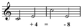 The concept of interval class accounts for octave, enharmonic, and inversional equivalency. Consider, for instance, the following passage: