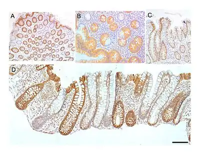 In these images the cells have been stained to show a brown-orange color if the cells produce a mitochondrial protein called cytochrome c oxidase subunit I (CCOI or COX-1). The nuclei of the cells (located at the outer edges of the cells lining the walls of the crypts) are stained blue-gray with haematoxylin. As seen in panels C and D, crypts are about 75 to about 110 cells long. The average crypt circumference is 23 cells.[8] From the images, an average is shown to be about 1,725 to 2530 cells per colonic crypt. Another measure was attained giving a range of 1500 to 4900 cells per colonic crypt.[9] Cells are produced at the crypt base and migrate upward along the crypt axis before being shed into the colonic lumen days later.[8] There are 5 to 6 stem cells at the bases of the crypts.[8]