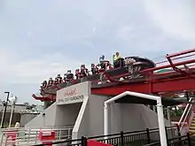 The steel track is painted red, while the supports are gray.[8] The steel track is 5,316 feet (1,620 m) in length, and the height of the lift is approximately 232 feet (71 m).[2][3][7] The angle of the first descent is approximately 74 degrees.[2][25] Also, the roller coaster includes trim brakes and magnetic brakes for speed control.[26][27] In 2020, the track was repainted.[28] The tracks weigh 1.567 million pounds (711 t) and the supports weigh about 1.5 million pounds (680 t), giving the ride structure a total weight of about 3.391 million pounds (1,538 t).[8]