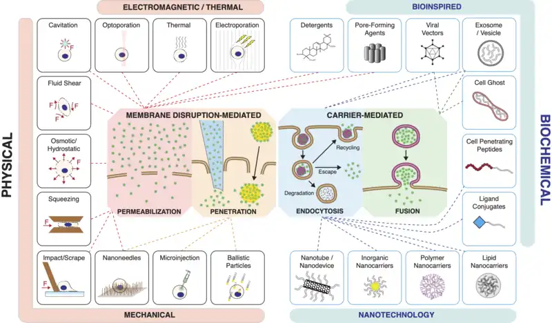 Methods of intracellular delivery mapped to mechanism. Methods are linked to their mechanism of action, being 1) permeabilization, 2) direct penetration, 3) endocytosis, or 4) fusion .[1] Some method categories can operate through multiple mechanisms (e.g. certain pore-forming toxins induce endocytosis and subsequent endosome disruption while others transiently permeabilize the plasma membrane). Most of the physical methods are membrane disrupting while most of the biochemical methods are carrier-mediated.