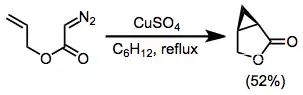 α-Diazoesters are not as efficient as diazoketones at intramolecular cyclizations in some cases because of the propensity of esters to exist in the trans conformation about the carbon–oxygen single bond.[12] However, intramolecular reactions of diazoesters do take place—in the example in equation (5), copper(II) sulfate is used to effect the formation of the cyclopropyl ester shown.[6]