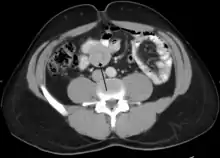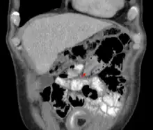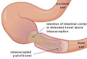Intussusception is a medical condition in which a part of the intestine folds into the section immediately ahead of it.[1] It typically involves the small bowel and less commonly the large bowel.[1] Symptoms include abdominal pain which may come and go, vomiting, abdominal bloating, and bloody stool.[1] It often results in a small bowel obstruction.[1] Other complications may include peritonitis or bowel perforation.[1]