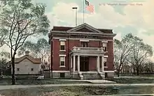 When the county seat was located at Iola, the town company donated 100 lots to the county, to aid in the construction of public buildings. In July, 1866, bonds were voted to help raise the necessary funds, and not long after a building was purchased from George J. Eldridge, and used for county offices and all court house purposes. In 1877, a new court house, built of stone, was purchased for $1,800, and the old one was sold to the school district to use for a schoolhouse, for $500. The school was kept in two buildings, one the large two-story stone structure erected in 1868, and having an imposing appearance with its twin towers. The other building was a two-story frame, and situated just south of the stone schoolhouse.[11]