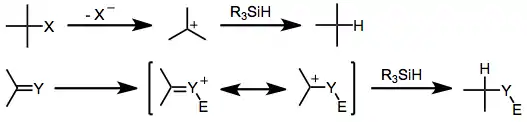 Ionic hydrogenation refers to hydrogenation achieved by the addition of a hydride to substrate that has been activated by an electrophile. Some ionic hydrogenations entail addition of H2 to the substrate and some entail replacement of a heteroatom with hydride.[1] Traditionally, the method was developed for acid-induced reductions with hydrosilanes. Alternatively ionic hydrogenation can be achieved using H2. [2] Ionic hydrogenation is employed when the substrate can produce a stable carbonium ion. Polar double bonds are favored substrates.