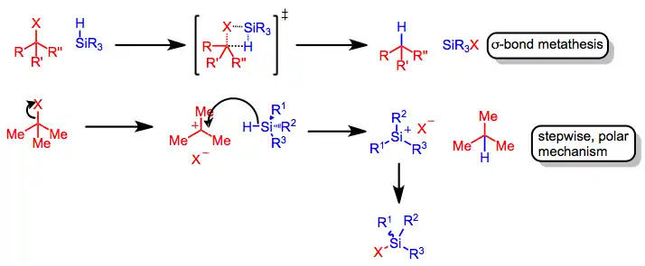 Upon the generation of a carbocation, rate-determining hydride transfer from the organosilane occurs to yield a reduced product. Retention of configuration at silicon has been observed in silane reductions of chiral triaryl methyl chlorides in benzene. This result suggests that the exchange of chlorine for hydrogen occurs through σ-bond metathesis.[3] Reductions in more polar solvents may involve silicenium ions.[4]