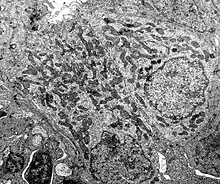 Marine teleost fishes consume large quantities of seawater to reduce osmotic dehydration.[9] The excess of ions absorbed from seawater is pumped out of the teleost fishes via the ionocytes.[9] These cells use active transport on the basolateral (internal) surface to accumulate chloride, which then diffuses out of the apical (external) surface and into the surrounding environment.[10] Such mitochondrion-rich cells are found in both the gill lamellae and filaments of teleost fish. Using a similar mechanism, freshwater teleost fish use these cells to take in salt from their dilute environment to prevent hyponatremia from water diffusing into the fish.[10] In the context of freshwater fish, ionocytes are often referred to as "mitochondria-rich cells", to emphasis their high density of mitochondria.[11]