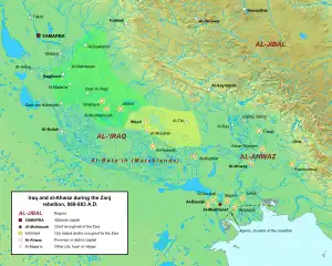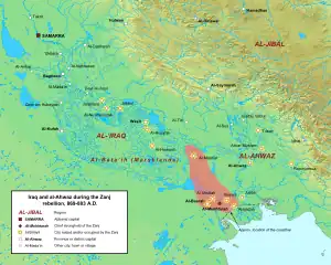 ![]() Map of lower and central Iraq (black) and the surrounding regions (red) during the Zanj Rebellion. | |||||||
