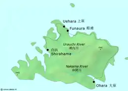 The island has an area of 289.27 km2 (111.69 sq mi) and a 2005 population of 2,347. The island does not have an airstrip, and most visitors—over 390,000 in 2006—arrive from Ishigaki by ferry, a 31.4 km (19.5 mi) ride to Uwahara Port (上原港) on Iriomote's northeast coast or Ōhara Port (大原港) on the southeast coast. Administratively, the island belongs to Taketomi Town, Okinawa Prefecture.[1] Its infrastructure is limited to a single coastal road connecting the hamlets on the northern and eastern shores.