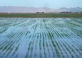 Negative impacts frequently accompany extensive irrigation.[35] Some projects which diverted surface water for irrigation dried up the water sources, which led to a more extreme regional climate.[36] Projects that relied on groundwater and pumped too much from underground aquifers created subsidence and salinization. Salinization of irrigation water in turn damaged the crops and seeped into drinking water.[36] Pests and pathogens also thrived in the irrigation canals or ponds full of still water, which created regional outbreaks of diseases like malaria and schistosomiasis.[37][38][39] Governments also used irrigation schemes to encourage migration, especially of more desirable populations into an area.[40][41][42] Additionally, some of these large nationwide schemes failed to pay off at all, costing more than any benefit gained from increased crop yields.[43][44]