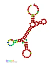 The iscRSUA operon encodes for the proteins required in iron–sulfur cluster biosynthesis where the expression of this operon is regulated by RyhB and iscR, a transcription repressor.[1][2][3] Under sufficient iron conditions RyhB binds to iscRSUA mRNA and promotes the degradation of the mRNA located downstream of iscR. Scanning the intergenic regions of this polycistronic mRNA and using Mfold software a secondary structure was predicted within the intergenic region between iscR and iscS and later confirmed by lead acetate probing.[4] Mutations that disrupt this secondary structure resulted in the degradation of iscR mRNA after RyhB binding. 3′ RACE analysis of the iscR mRNA fragment identified the intergenic RNA at the 3′ end. These results suggest that this intergenic RNA element acts as an iscR mRNA stability element by protecting iscR from exonuclease degradation.