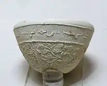 A jug, inspired by Sassanid models, appeared at the same time - late 7th-early 8th century. Its decoration is gouged (hollowed out with a gouge) and incised, its high quality paste reflects the refinement of these series, which disappeared at the beginning of the 9th century.[8]