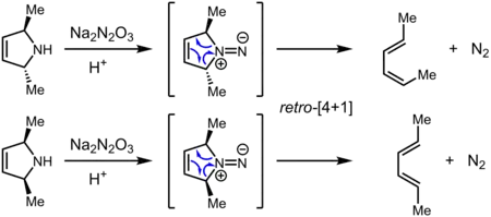 Although isodiazenes are formally isoelectronic with ketones and aldehydes, the reactivity of this exotic functional group is very different. They are generally prepared by oxidation of the hydrazine (R2N–NH2), reduction of the 1,1-diazene oxide (R2N–N=O), 1,1-elimination of MX from R2N–NMX (M = Na, K; X = SO2Ar), or treatment of secondary amines with Angeli's salt, Na2N2O3, in the presence of acid. Isodiazenes participate in cycloaddition reactions with alkenes to generate N-aminoaziridines. In the absence of other reactants, they undergo reactions in which N2 is eliminated to give an organic residue or residues through both concerted and nonconcerted pathways. Cyclic isodizenes in particular readily undergo cycloelimination and chelotropic elimination reactions.[2] Some of these reactions are believed to be concerted pericyclic processes, as evidenced by stereospecificity that is consistent with the conservation of orbital symmetry.