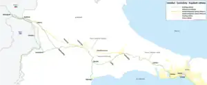 The Istanbul–Kapıkule railway is a 229 km (142 mi) long rail line currently under construction in Turkey. Once finished, this railway will provide a high-speed rail link between the Istanbul suburbs and the Bulgarian border, just West of Edirne. The rail line will be double tracked and electrified for its whole length, and is intended for use by both freight and passenger rail. The railway will allow for high-speed rail service between Edirne and Istanbul, and is intended to strengthen the rail transport link between Turkey and Europe.[1] The rail line is planned to open in 2024.