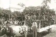 The 1930s were difficult for the peasants and the proletarianized urban workers, but still, they participated in the apotheosis. They joined the parades of floats of the Festa da Uva, with their tools and work clothes under the frenzied applause of the visiting crowd. The feast became a tourist success in the state in a few years, understood as the main stage for ideological, identity and community representations of "Italianness", receiving collaborators and exhibitors from all over the colonial region and the approval of distinguished Portuguese-Brazilian intellectuals and politicians.[32][34]