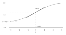 If then these simplify to and meaning that b equals the 50% success level (difficulty), and a (divided by four) is the maximum slope (discrimination), which occurs at the 50% success level. Further, the logit (log odds) of a correct response is (assuming ): in particular if ability θ equals difficulty b, there are even odds (1:1, so logit 0) of a correct answer, the greater the ability is above (or below) the difficulty the more (or less) likely a correct response, with discrimination a determining how rapidly the odds increase or decrease with ability.