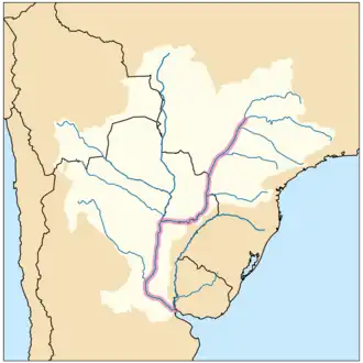 Map of the Paraná River drainage basin with the river indicated. Most outcrops of the Ituzaingó Formation flank the middle course of the Paraná River.