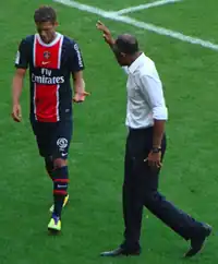 On 25 July 2011, Paris Saint-Germain confirmed that the club had signed Ménez to a three-year contract.[55] The transfer fee was €8 million plus possible future incentives.[56][57] He was presented to the media the same day – alongside fellow new signing and international teammate Blaise Matuidi – and was assigned the number 7 shirt.[58] Ménez made his club debut for the team in its 1–0 defeat to the New York Red Bulls at the Emirates Cup. He made his competitive debut for PSG on 6 August 2011 in the team's opening 1–0 league defeat to Lorient.[59] The following week, he assisted on the team's opening goal, scored by Kevin Gameiro, in a 1–1 draw with Rennes.[60] On 18 August 2011, in PSG's first leg UEFA Europa League playoff round tie against Luxembourger club Differdange, Ménez scored the final goal for the team in a 4–0 away win. He also assisted on a goal in the victory.[61] Three days later, he again assisted Gameiro for a goal in a 2–1 win over Valenciennes, helping PSG earn its first league win of the season. On 28 August, Ménez netted his first league goal for the club away to Toulouse; Paris Saint-Germain won the match 3–1.