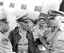 Major General J. L. Collins, commanding VII Corps, with Field Marshal Sir Bernard Montgomery, commander of the 21st Army Group, and Major General Matthew Ridgway, Commanding XVIII Airborne Corps, December 1944.
