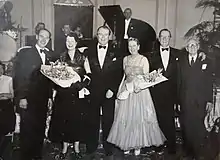 ![]() Jack (centre) and Muriel Warner photographed at the Granville Hotel, Ramsgate, with proprietors and friends William and Florence Hamilton, East Kent Times, 8 April 1953 | |