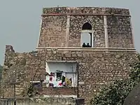 The fort was also known as ‘Muhammadabad’, but inferred as a latter-day development.[4] The two gates on the southeast and southwest of Adilabad fort had chambers at the lower level while the east and west gates had grain bins and courtyards at the upper floors. The fortifications built, linking with the other two city walls, was 12 m (39.4 ft) in thickness and extended to a length of 8 km (5.0 mi). Another smaller fortress, called the Nai-ka-Kot (literally "Barber's fortress") was also built at a distance of about 700 m (2,296.6 ft) from Adilabad, with the citadel and army camps, which are now seen only in ruins.[11]