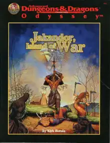 Jakandor, Island of War is a supplement which introduces the land of Jakandor, populated by two antagonistic societies: the barbarian Knorr, who have been exiled to this island by their patron deity for their sins, and the Charonti, a race of necromancers.[1][2][3] This book concentrates on the Knorr, who can receive redemption from their deity by destroying the Charonti. The setting uses the rules for the second edition of Dungeons & Dragons.