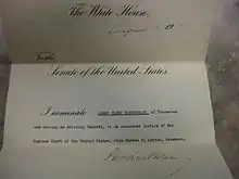 On August 19, 1914, Wilson nominated McReynolds as an associate justice of the United States Supreme Court,[16] to succeed Horace H. Lurton. The United States Senate confirmed him on August 29, by a 44–6 vote,[16][17] and he was sworn into office on October 12.[1]