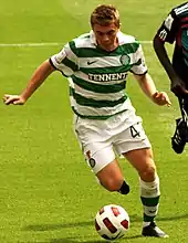 He made his first European appearance for Celtic in a Champions League qualifying game against Braga in July 2010.[9] A few days later he won the man of the match award for his performance in the Emirates Cup game with Olympique Lyonnais.[10] He continued this fine form into the league campaign, scoring against St Mirren in a 4–0 victory.[11] Forrest played in both legs of Celtic's Europa League qualifier against Utrecht. Forrest was named the SPL Young Player of the Month for August 2010[12] In the following month Forrest opened the scoring against Hearts.[13] He made his Old Firm debut in a 2–0 win at Ibrox in January 2011.[14] He received the first red card of his career in the following match against Hamilton.[15] He would score against Hearts, before being rewarded for his form with a new five-year deal on 28 January 2011.[16][17] Forrest collected his first winner's medal on 21 May 2011 when he came on a late second-half substitute for Kris Commons in Celtic's 3–0 Scottish Cup Final win over Motherwell.[18] He finished the season with 3 goals and 1 assist after 25 appearances.