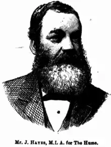 - ↑ "J Hayes MLA for The Hume". Australian Town and Country Journal. 10 September 1887. p. 10. Retrieved 11 July 2021 – via Trove.