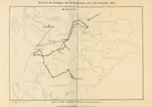 It was at this critical juncture that Lawrie of Blackwood paid him a second visit, not to assist, but to discourage him, by proposing a second time that he should disband his followers and trust to an indemnity, which he assured him the Duke of Hamilton would exert himself to obtain for them. As he had no credentials to show, and seemed to be speaking merely his own sentiments without the authority of either party, Blackwood's proposal excited suspicions of his motives. He, however, remained with the party, which had now moved on to Collington, all night; and in the morning was the bearer of a letter from Colonel Wallace to General Dalzell, who sent it to the council, while he hastened himself to pursue the insurgents. Wallace in the meantime marched to Ingliston Bridge, at the point of the Pentland Hills, and was in the act of drawing up his little party to prevent straggling when he learned that Dalzell, with the advance of the king's troops, was within half a mile of him. There had been a heavy fall of snow through the night, but it was succeeded by a clear frosty day; and it was about noon of that day, the 28 of November, when the armies came in sight of each other. That of the insurgents did not exceed 900 men, ill-armed, worn out with fatigue, and half starving. The royal army, which amounted to upwards of 3000 men, was in the highest order, and well provided in all respects. Wallace disposed his little army upon the side of a hill running from north to south. The Galloway gentlemen, on horseback, under M'Clellan of Barmagachan, were stationed on the south; the remainder of the horse, under Major Learmont, on the north; and the foot, who were exceedingly ill armed, in the middle. Dalzell seems to have been for some time at a loss how to proceed; having such a superiority, however, in numbers, he detached a party of horse, under General Drummond, to the westward, in order to turn Wallace's left wing. This detachment was met by the Galloway gentlemen, under Captain Arnot and Barmagachan, and completely routed in an instant; and had Wallace been in a condition to have supported and followed up this masterly movement, the king's army would inevitably have lost the day. A second attack was met by Major Learmont with equal spirit; and it was not till after sunset, when Dalzell himself charged the feeble unarmed centre with the strength of his army, horse and foot, that any impression was made upon them. This charge they were unable to resist, but were instantly broken and dispersed. The nature of the ground, and the darkness of the night, favoured their flight, and there were not more than 100 of them killed and taken by the victors; but they were in an unfriendly part of the country, and many of the fugitives were murdered by their countrymen.[14]