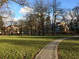 The park has been designed by Konrad Neumann, then director of the Municipal gardens of Bromberg in 1901; its initial surface was 2.8 hectares (28,000 m2). It was part of urban plans laid out in 1903, and developed through 1911[1] The design was inspired from English gardens, with about 80 species of trees and ornamental trees, mainly endemical native species.[2] The main entrance was located at Bismark Platz, today at the junction between Słowackiego and January 20, 1920, streets. The northern edge on Bulöw Straße (Adam Mickiewicz Alley) was a lawn planted with roses and low shrubs.[3]
