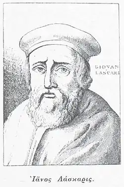 Janus Lascaris (Greek: Ἰανὸς Λάσκαρις, Ianos Laskaris; c. 1445, Constantinople – 7 December 1535, Rome), also called John Rhyndacenus (from Rhyndacus, a country town in Asia Minor), was a noted Greek scholar in the Renaissance.