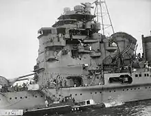 It was discovered after the end of the war that Takao was manned by a skeleton crew and had no ammunition aboard for her 8-inch main armament.[4] Japanese forces surrendered Seletar Naval Base to the British on 21 September 1945. On 27 October 1946, Takao was towed to the Strait of Malacca and was sunk as a target ship by the light cruiser HMS Newfoundland on 29 October 1946 at 03°05′05″N 100°41′00″E / 3.08472°N 100.68333°E.[4] She was removed from the navy list on 3 May 1947.