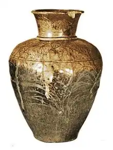 In the 3rd to 4th centuries AD, the anagama kiln, a roofed-tunnel kiln on a hillside, and the potter's wheel appeared, brought to Kyushu island from the Korean peninsula.[6]